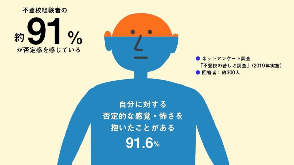 不登校経験者の過半数が、自分に自信が持てないと感じています。これは学校生活以外でも、社会のプレッシャーが原因です。